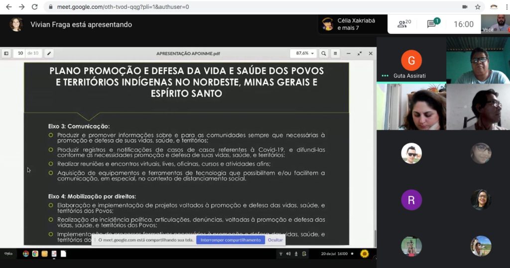 Objetivo dessa reunião foi de discutir ações da APOINME em tempo de pandemia e isolamento social, Ações no combate ao Covid; Recursos Vakinha; Apresentação Plano APOINME; Cursos EaD; Mulheres – 01 ano da Marcha; Envolvimento dos Coordenadores e das Micros de forma efetiva nas ações da Organização; Caso Xokleng – atuação da APOINME; Estratégias de ação a médio e longo prazo e Rede de Advogados indígenas (Weibe Tapeba); Medida STF ADPF (José Carlos).